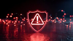 Glowing red shield with exclamation mark signals critical cybersecurity alert against dark background with bokeh lights, conveying urgent threat warning.