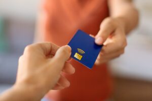 Closeup shot of young woman giving blue credit card to female hand